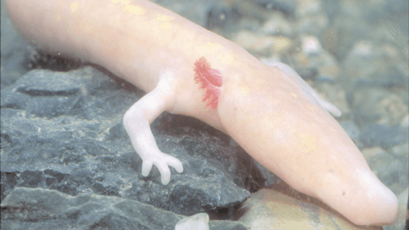 Cet amphibien des cavernes, dont la peau est totalement dépigmentée, mesure entre 15 et 25 centimètres. Il est aveugle, mais perçoit les vibrations de l’eau, et peut vivre jusqu’à 100 ans.